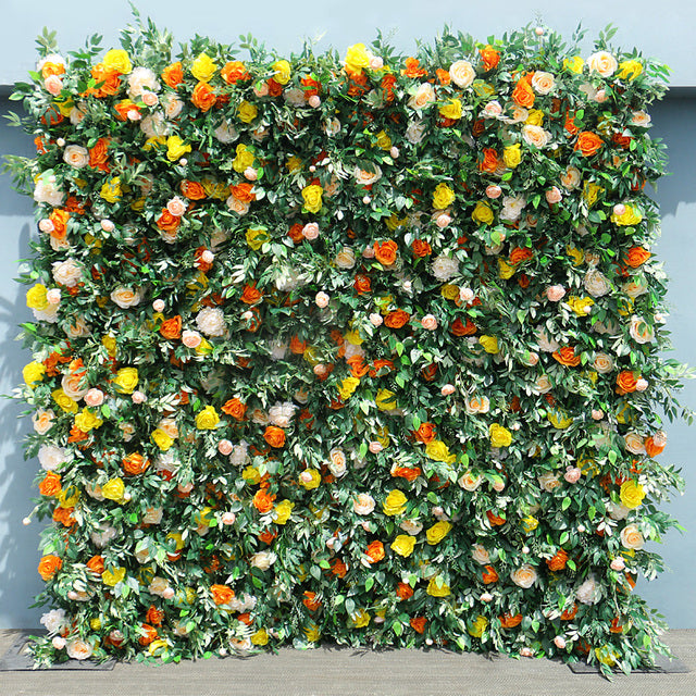 Yellow Orange Rose Green Leaves Cloth Roll Up Flower Wall Arrangement Fabric Hang Curtain Plant Wall Wedding Backdrop Decor Prop A7609