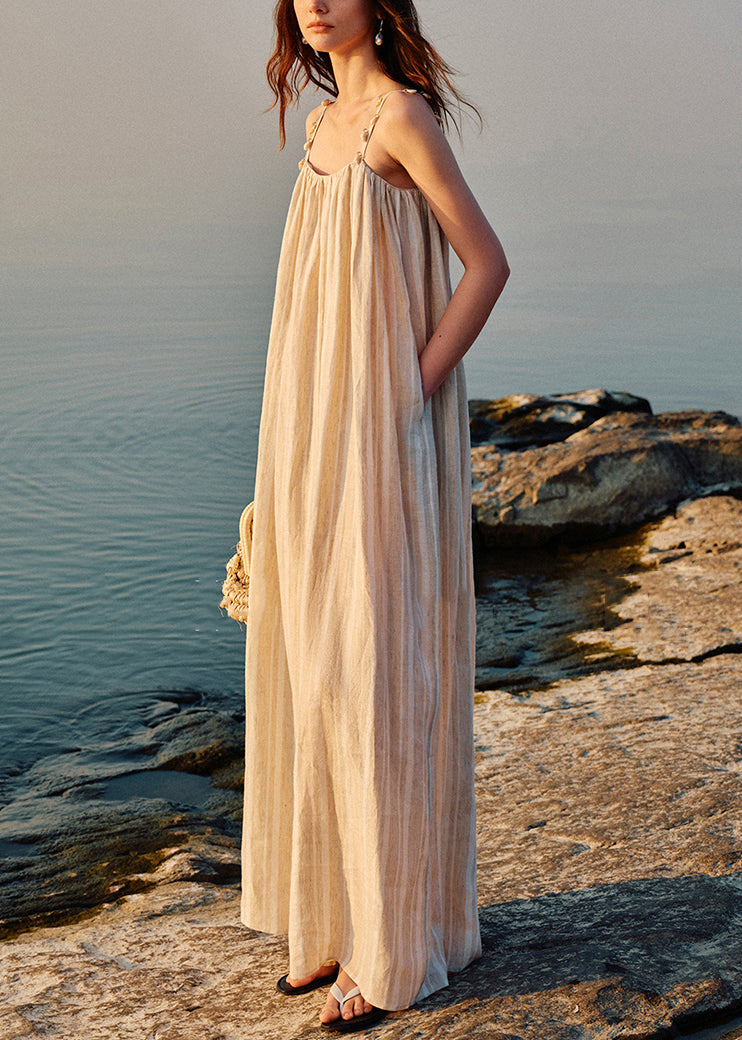 Apricot Shell Pockets Patchwork Linen Spaghetti Strap Dress Striped Summer