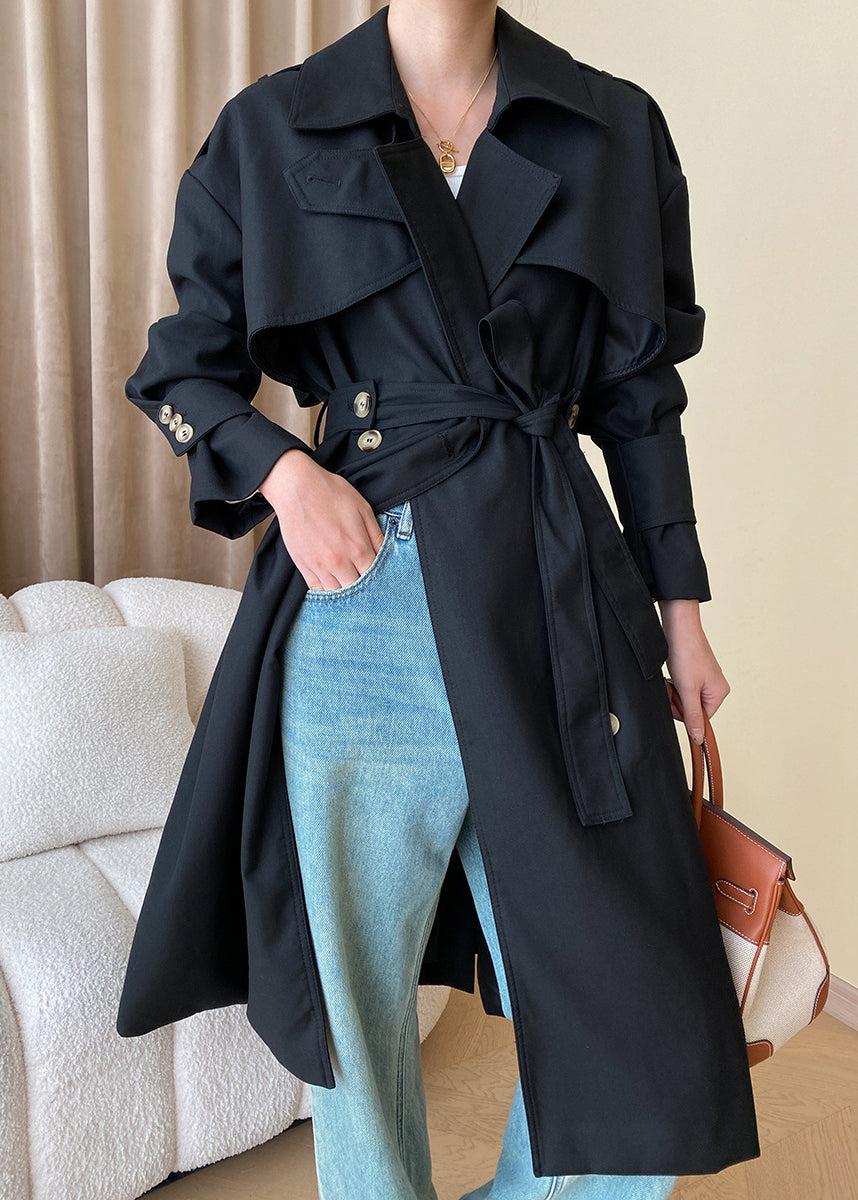 Black Button Cotton Long Trench Coat Peter Pan Collar Fall