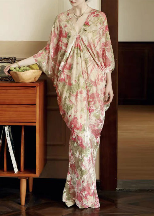 Chic Pink Print Wrinkled Silk Maxi Dresses Batwing Sleeve