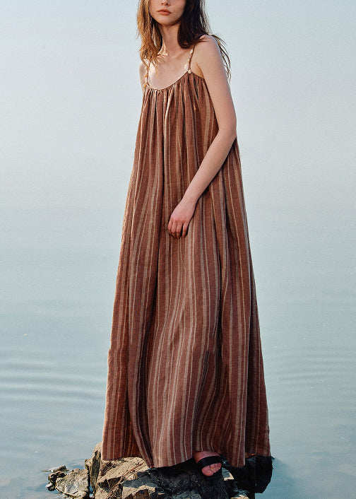 Striped Coffee O Neck Shell Pockets Linen Spaghetti Strap Dress Sleeveless