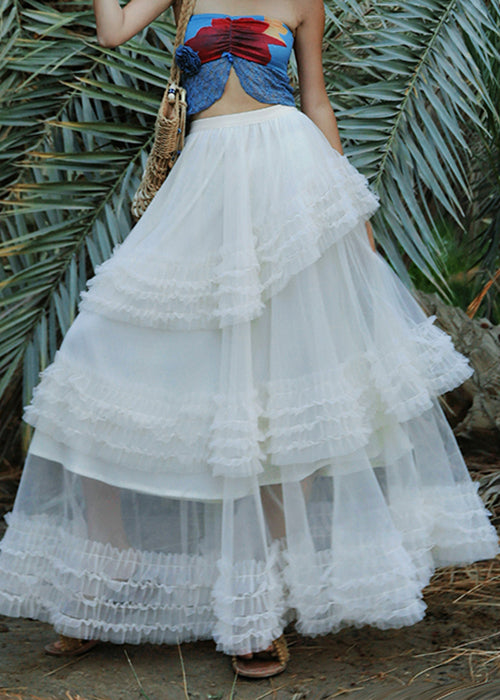 White Elastic Waist Solid Tulle Summer Maxi Skirts Ruffled
