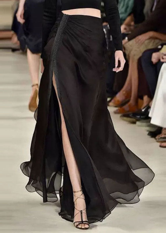 Women Black Ruffled Side Open Patchwork Chiffon Skirt Summer
