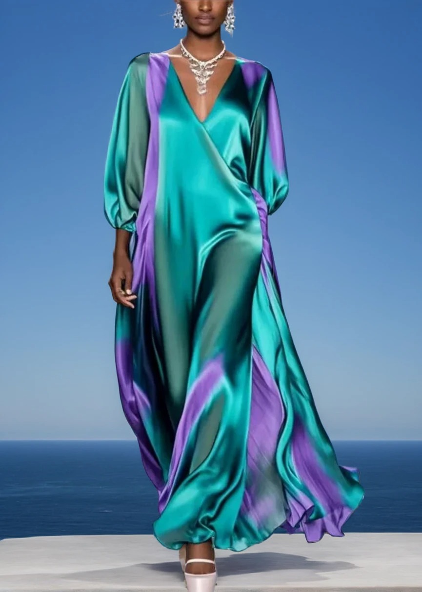 Women Green Oversized Tie Dye Silk Robe Dresses Bracelet Sleeve