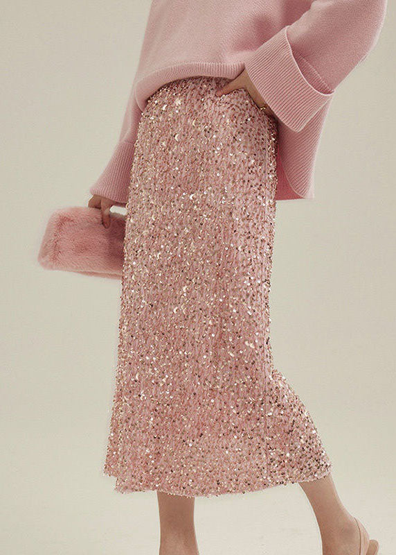 Women Pink Sequins Patchwork Back Side Open Velour Skirt Spring